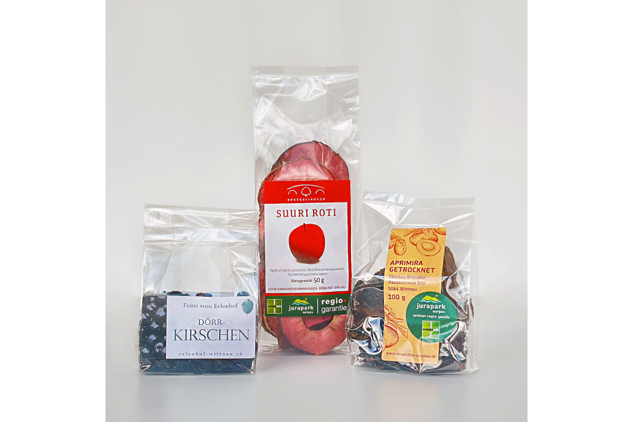 Ein wohltönender Dreiklang von prickelnden "Suuri Roti", kräftigen Wittnauer "Dörrkirschen" und sonnig-süssen "Aprimira", unserer Mirabellen-Aprikosen.